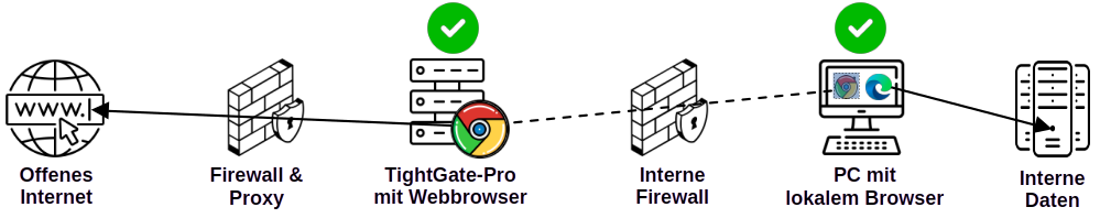 Der Browser für das Internet läuft außerhalb des internen Netzes und hat keinen Zugriff auf interne Daten. So kann aus dem Internet kein Schadcode eingeschleust werden und es besteht keine Gefahr eines unerlaubten Zugriffs.