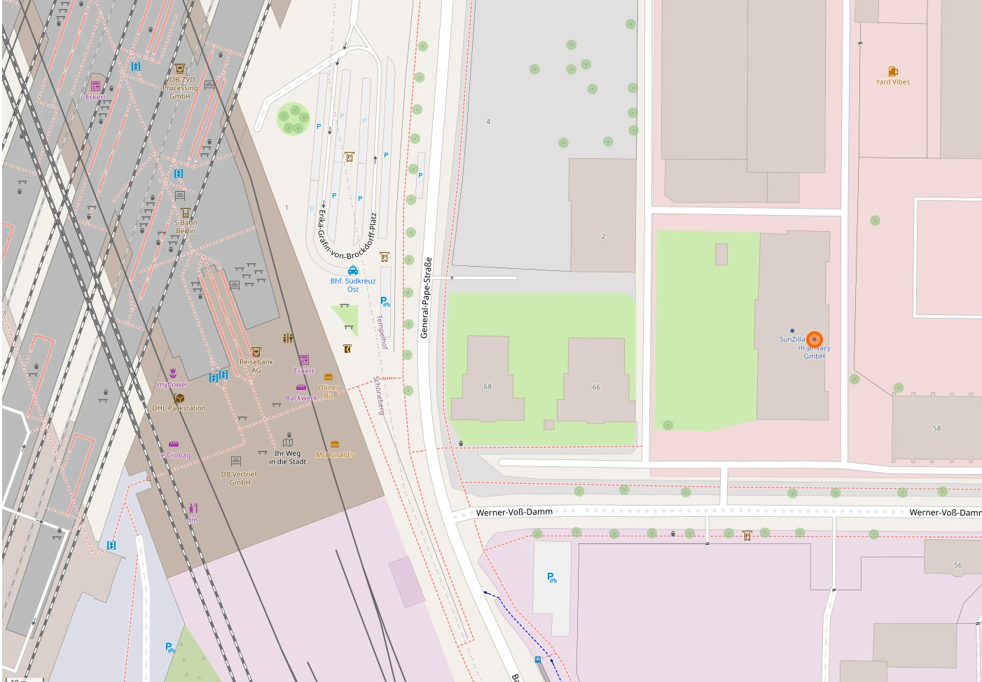 Sie finden uns unmittelbar am S-Bahnhof Südkreuz, der auf dem Berliner S-Bahn-Ring liegt. Daher empfehlen wir ausdrücklich die Anreise per S-Bahn – schneller und einfacher geht es kaum. Verlassen Sie in diesem Fall den S-Bahnhof durch die Osthalle (dm-Drogeriemarkt und McDonald’s-Restaurant) in Richtung Werner-Voß-Damm. Steigen Sie die breiten Stufen hinauf und überqueren Sie die Straße geradeaus in den Werner-Voß-Damm. Unser Gebäude befindet sich nur 100 Meter weiter auf der linken Seite.