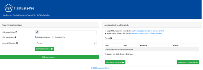 Die Linkweiche MagicURL bekommt Hilfe! Mit dem neu von der m-privacy GmbH bereitgestellten Add-on für den Browser Firefox ist die Erzeugung der Hilfsdatei URL_Whitelist.txt jetzt ganz einfach. Das Add-on ist intuitiv nutzbar und kann über die Erweiterungen von Firefox bezogen werden.