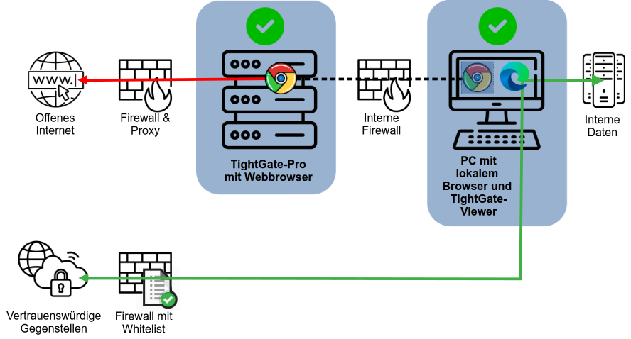 TightGate-Pro ist ein Remote-Controlled Browser System (ReCoBS) – ein fernsteuerbarer Webbrowser, der die Ausführungsumgebung des Browsers physisch vom Arbeitsplatzrechner trennt. Damit wird das interne Netzwerk wirksam vom Internet abgeschirmt und zuverlässig vor Angriffen und Datenabfluss geschützt.